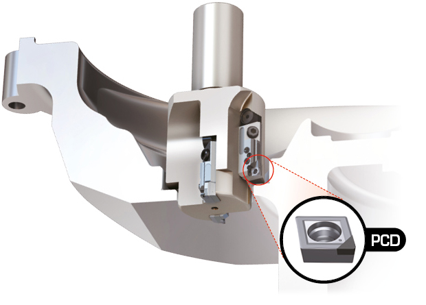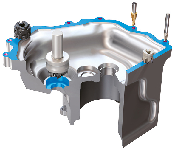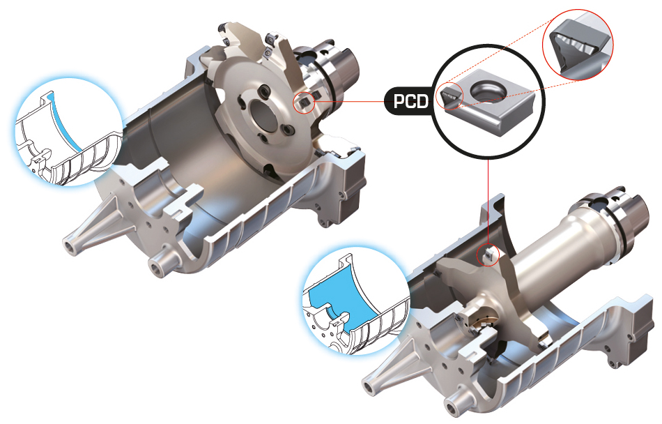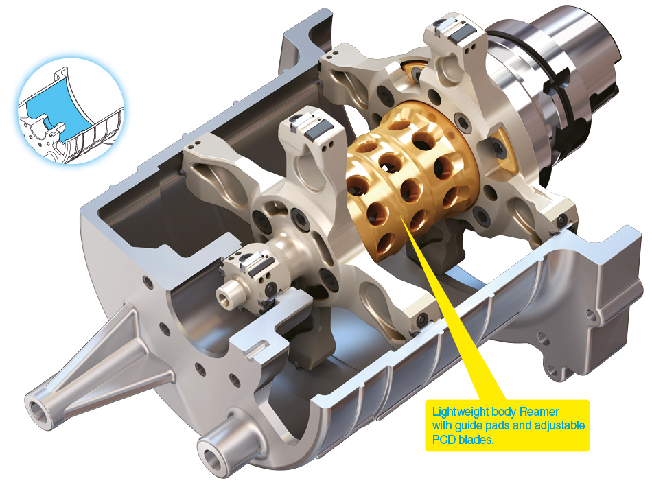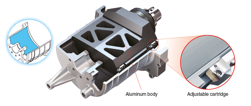 A special combination of fine-tuning boring tools is needed to keep up with the tight tolerances of the main holes. For automatic tool changers, creative ideas are needed to design a big-diameter special boring tool. They should be light in weight, strong in strength, and analyzed before production. Titanium or composite fiber materials can be applied to the cutter body and shank for a lightweight and strong body. |