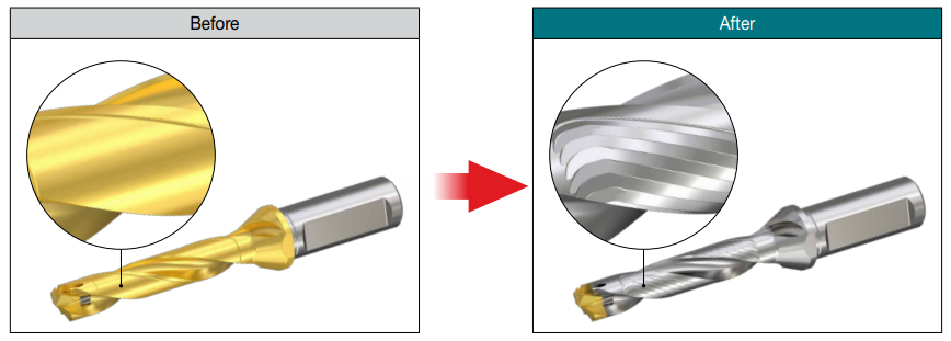 コーティング処理をしないフルート部は、より滑らかな研磨面を維持し、安定した切り屑の排出を実現致します。